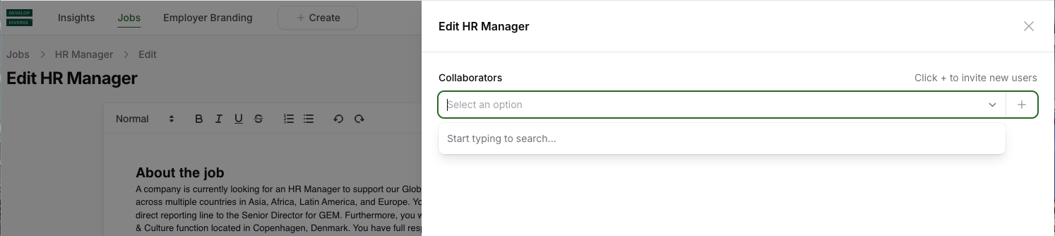 Collaborators are users with access to the text entry and editing rights. Add collaborators by searching for users in the field or adding a new colleague by entering their email address.