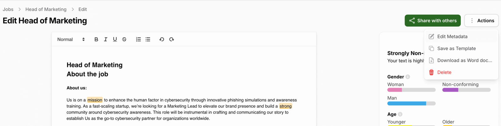 • The job ad heading is the visible title at the top of the job ad in the editor.