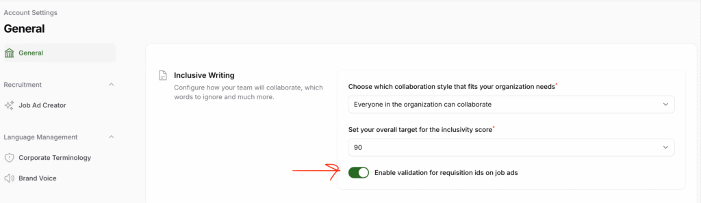 • Under the first section, Inclusive Writing, locate the toggle labeled Enable validation for Requisition IDs on job ads.