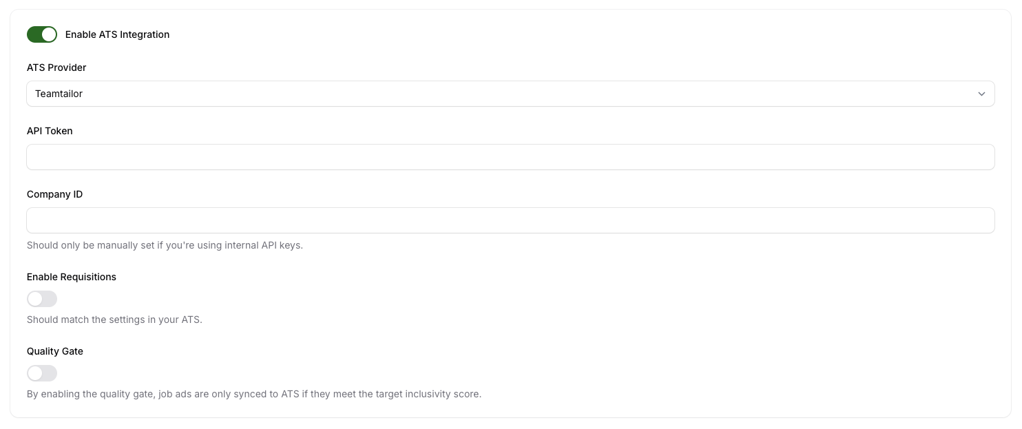 Under the Integrations section, find ATS. Turn on the toggle to enable ATS integration. - Choose Teamtailor