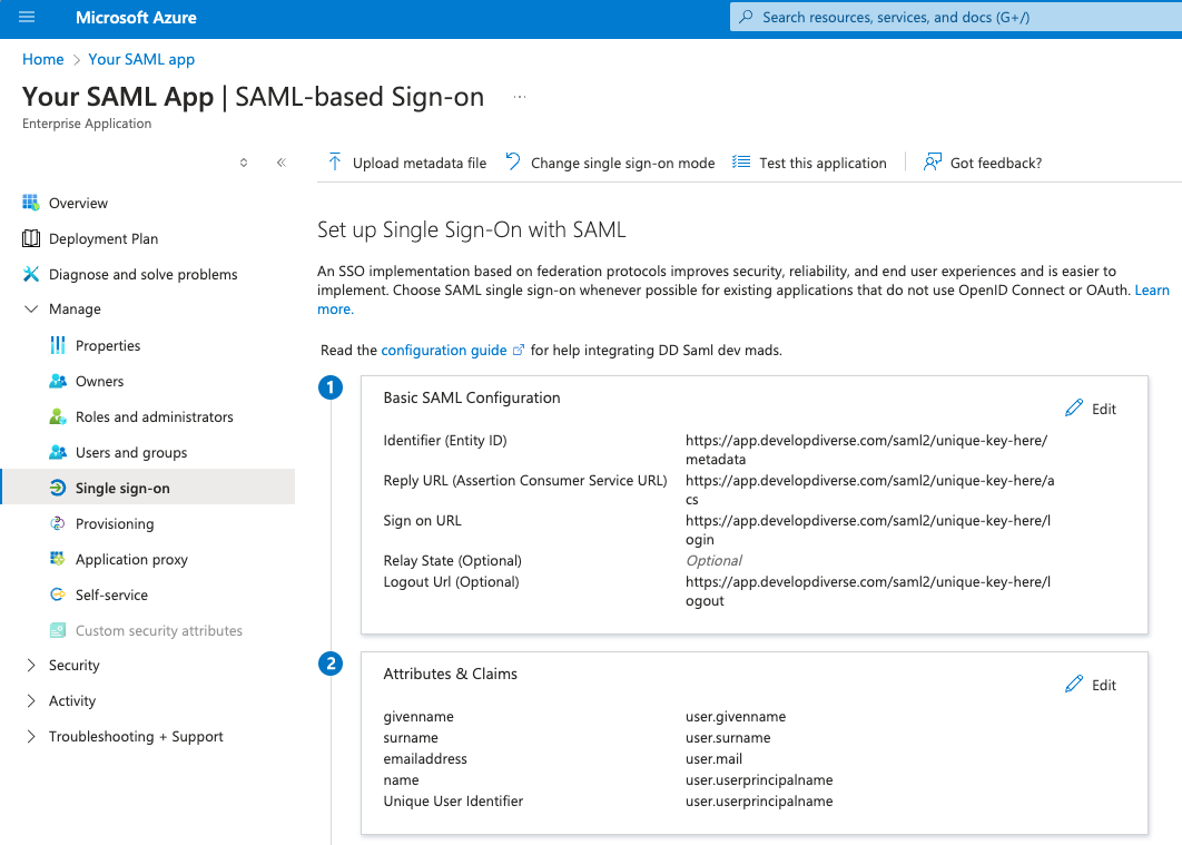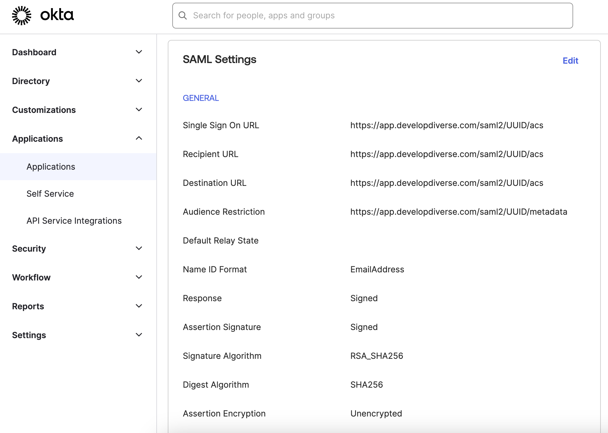 | Reply URL (Assertion Consumer Service URL) | https://app.developdiverse.com/saml2/unique-key-here/acs |