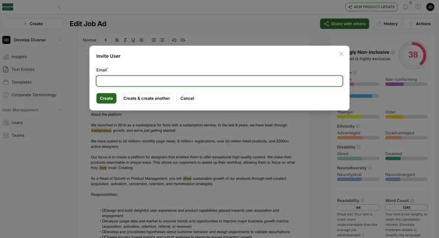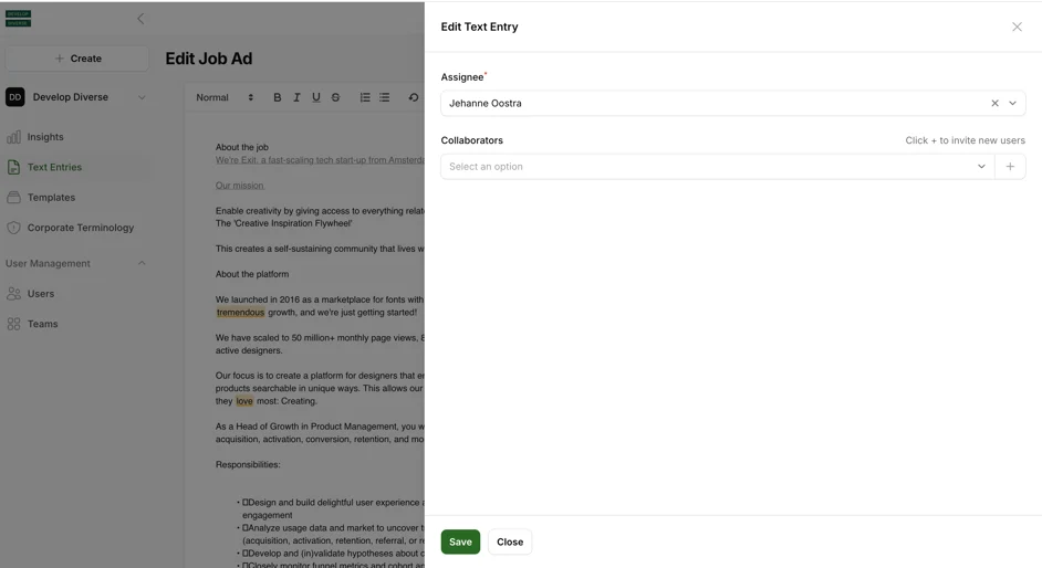 Collaborators are users with access to the text entry and editing rights. Add collaborators by searching for users in the field or adding a new colleague by entering their email address. New collaborators receive email notifications and alerts upon being added.