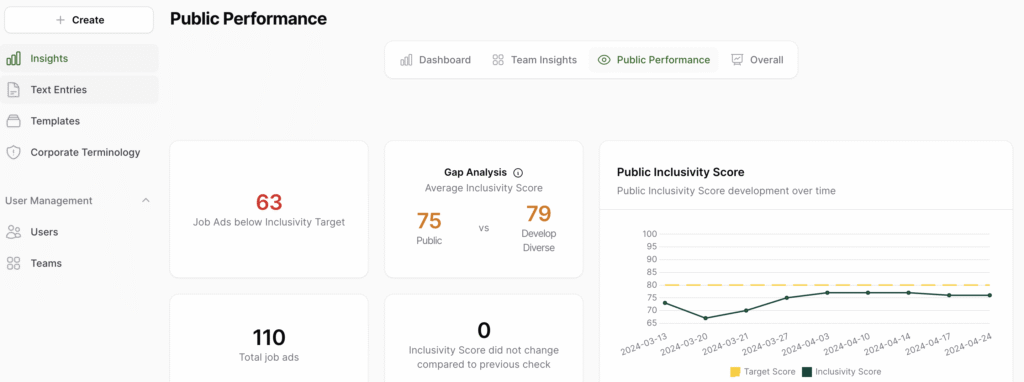 The Public Performance feature helps you monitor inclusivity scores, track progress over time, and spot gaps between your job ads on LinkedIn and those created in Develop Diverse.