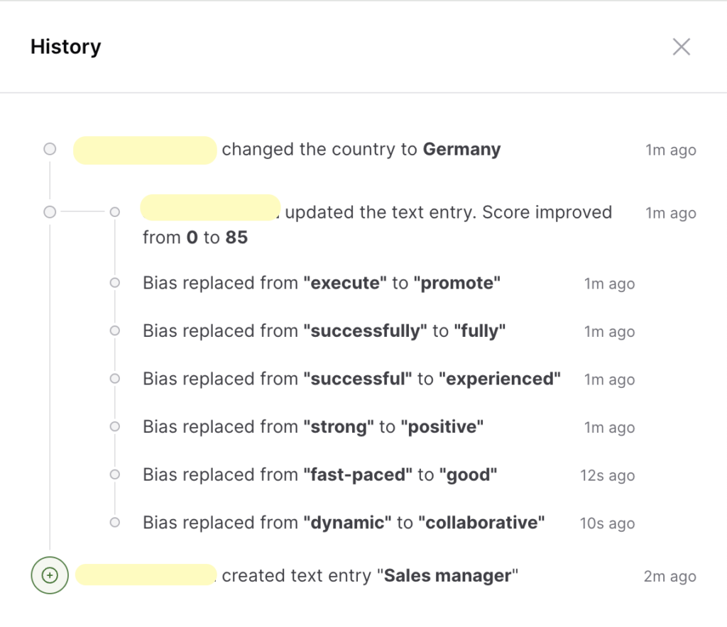 Every change made to text entries is automatically tracked, providing complete transparency and accountability. You can easily view these changes by clicking on History in the upper right corner of the text entry editor.